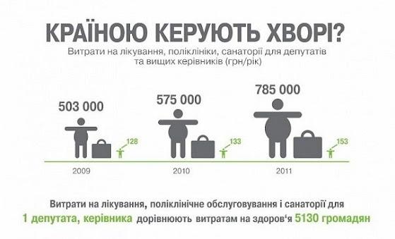 Нещодавно на сайті Максима Голосного прочитав цікаву інформацію. Виявляється витрати на лікування, оздоровлення, обстеження і так далі і тому подібне , на одного депутата Верховної ради в рік, складають стільки , що можна на ту суму пролікувати 5130 середньо - статистичних хворих . А тепер проста арифметика : 400 депутатів множимо на 5130 і отримуємо 2 мільйони 52 тисячі пацієнтів, яких можна було-би вилікувати від недуги. Стає зрозумілим чому у такій Державі немає коштів на утримання хоспісів. То-ж треба мабуть задуматися , а чи потрібний нам такий депутатський корпус та ще й з його результативністю ?